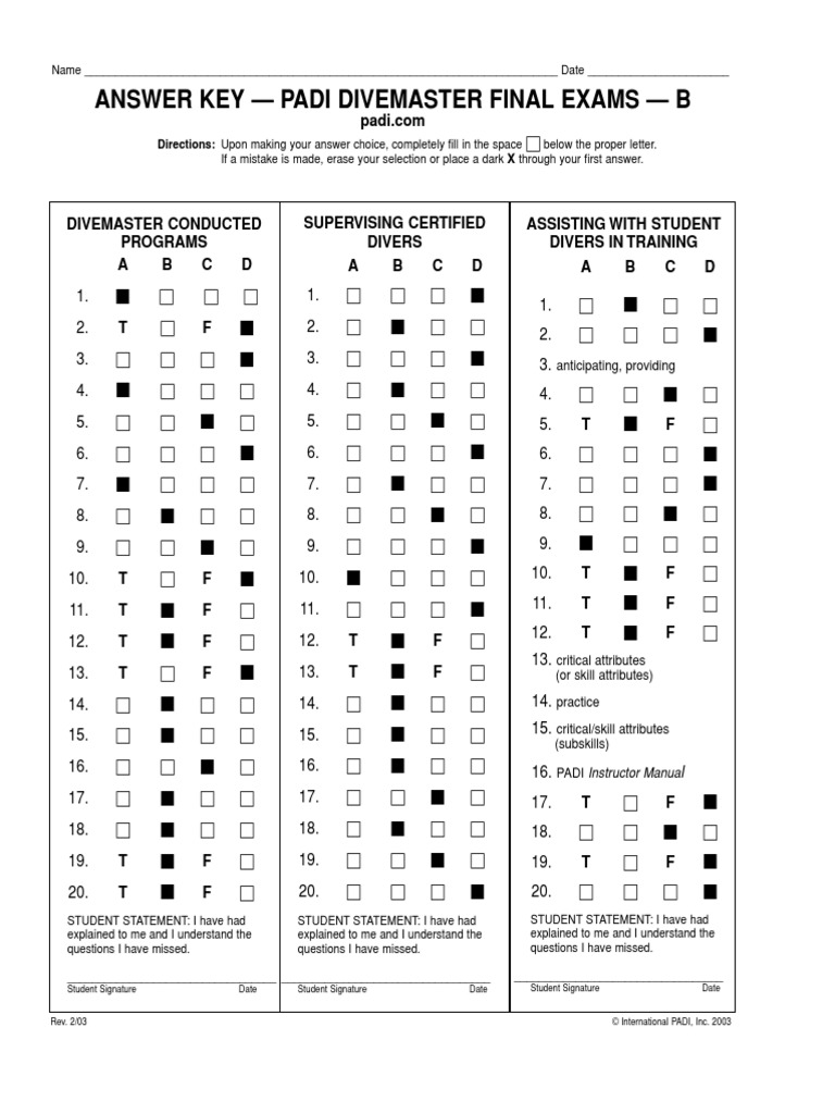 Padi Open Water Diver Course Final Exam Answer Sheet Short Padi