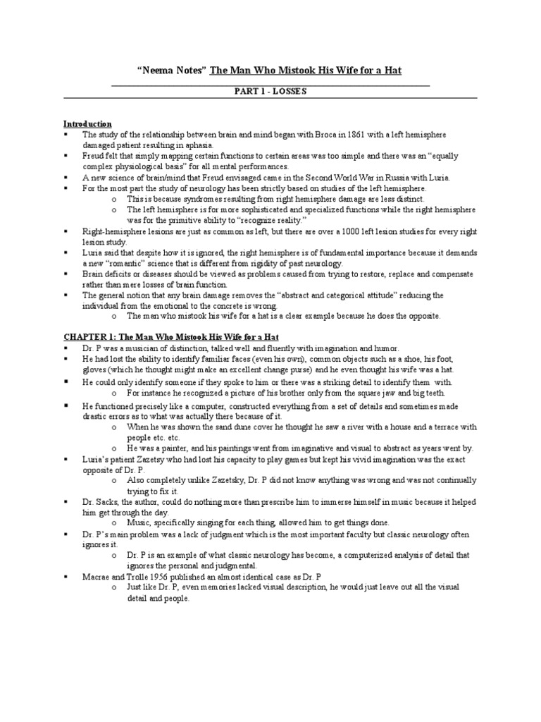 The Man Who Mistook His Wife For A Hat Notes Lateralization Of